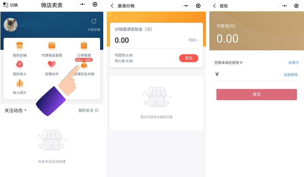 以上就是使用「微店卖卖」小程序实现分销收入提现的操作教程啦~如果您有更多其他的问题,可以尝试在微店店长版→设置→帮助与客服→帮助中心寻找帮助,或者进入微店帮助中心寻求帮助。以上就是关于“微店收入分销如何提现”的相关介绍,如果你想了解更多,欢迎咨询微店~