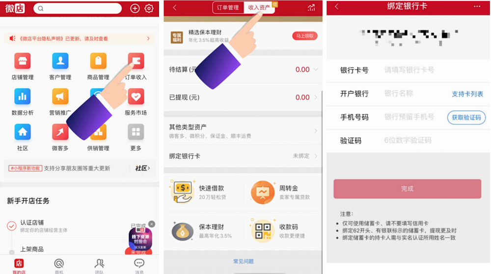 微店店⻓版:订单收⼊-收⼊资产-绑定银⾏卡