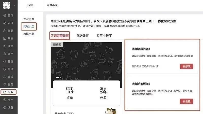 第一步:在微店后台,行业-同城小店-店铺装修设置中,将微店装修成“点单”的样子,方便客户选购;