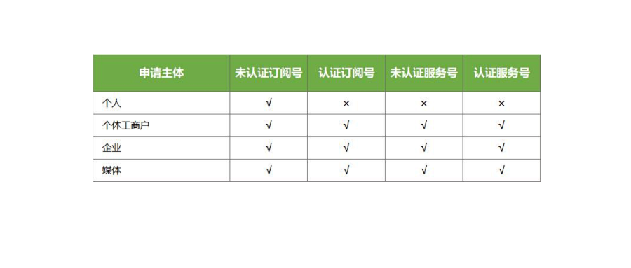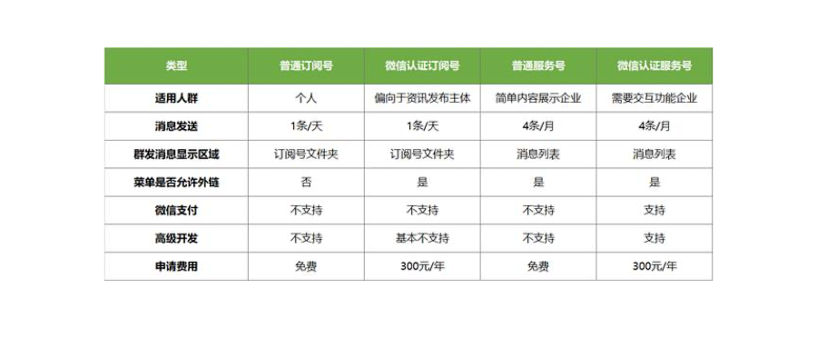 微信公众号分个人和企业两种,目前个人只能申请订阅号,而且不能认证,所以咱们今天主要说下企业服务号和订阅号,服务号每个月只能推送4篇文章,订阅号每天都可以推送文章,但是服务号的权限要比订阅号的权限要大。