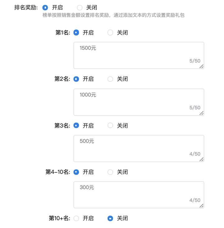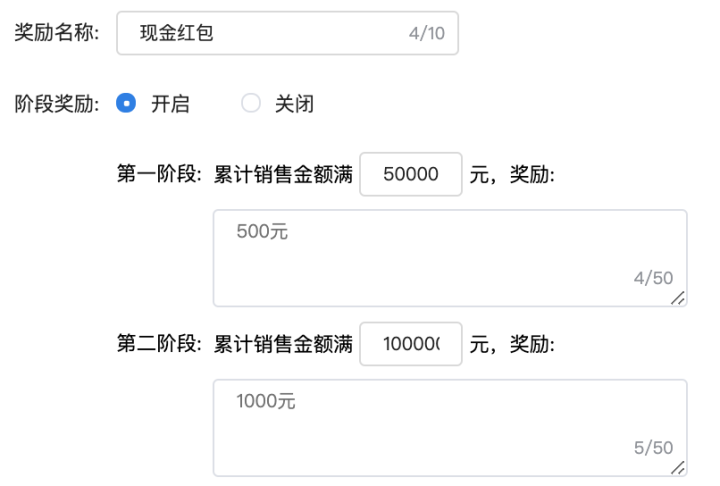 供应商可以选择是否开启阶段奖励。开启后,榜单分为2个阶段,供应商自定义****销售金额,达到后设置对应的奖励。