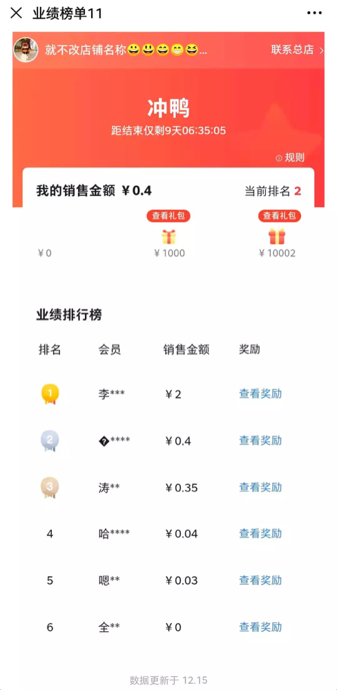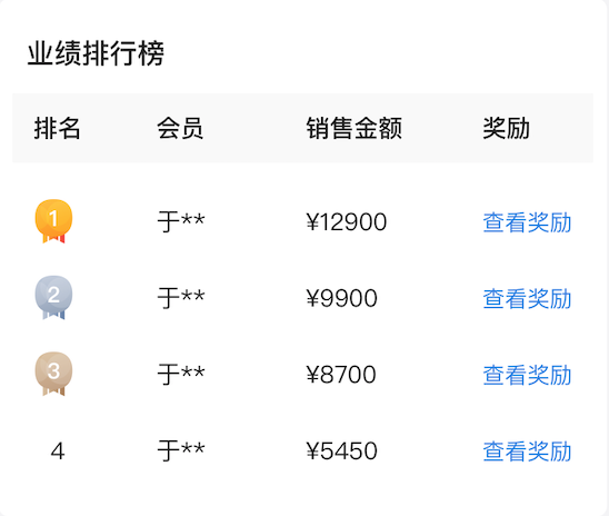 分销商侧:页面展示如下,分销商可以实时查看自己的销售金额,第一阶段和第二阶段的奖励明细,以及上榜的分销商们的销售金额、排名、具体奖励等。