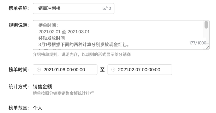 设置榜单名称、规则说明、榜单开始/结束的时间。