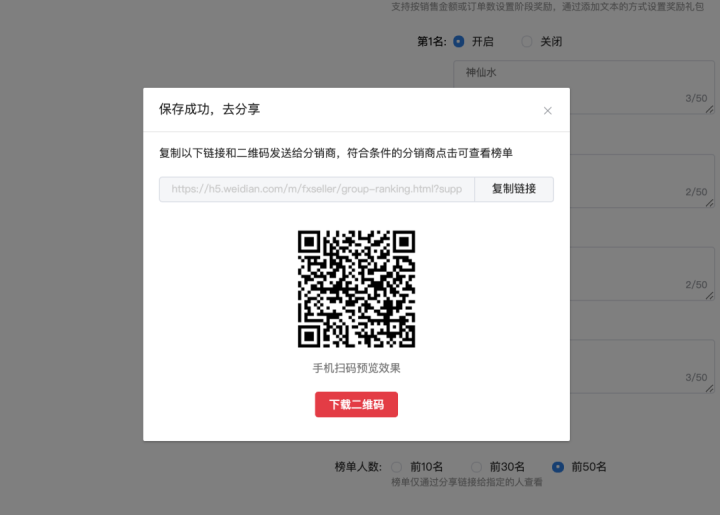 复制下面的链接或二维码发送给分销商,符合条件的分销商点击链接即可查看榜单。