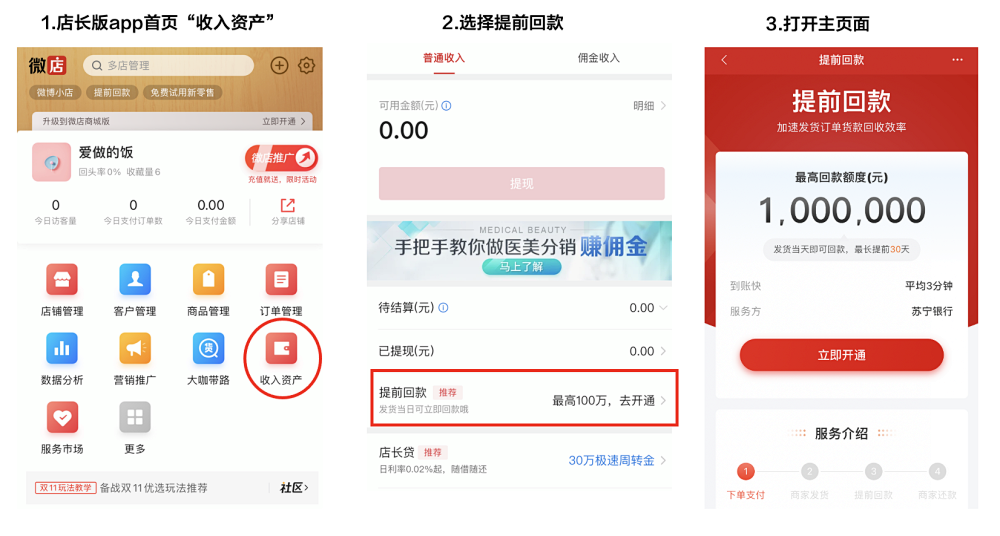 2、会根据店铺交易情况,核定一个提前收款的额度,在额度范围内,商家可以根据店铺应收账款(交易中金额)申请本次回收金额,申请期限为30天,苏宁银行会先行垫付资金,打款至商家银行卡中。