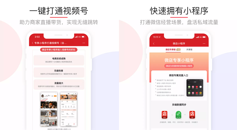 商家开通个人小程序后,微店还可支持⼀键同步H5店铺装修,完全同步H5商城,⽆需⼆次设计搭建;且有⼩程序专属模版,如「同城⼩店」等