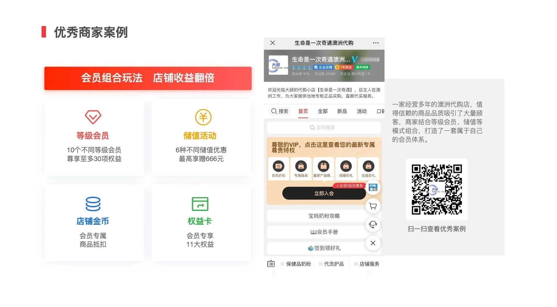 一家经营多年的澳洲代购店,首先是有值得信赖的品质,通过营销节日的宣传吸引了顾客,商家结合等级会员、储值的模式组合,打造了一套属于自己的会员体系,对于经营的增长达到300%。